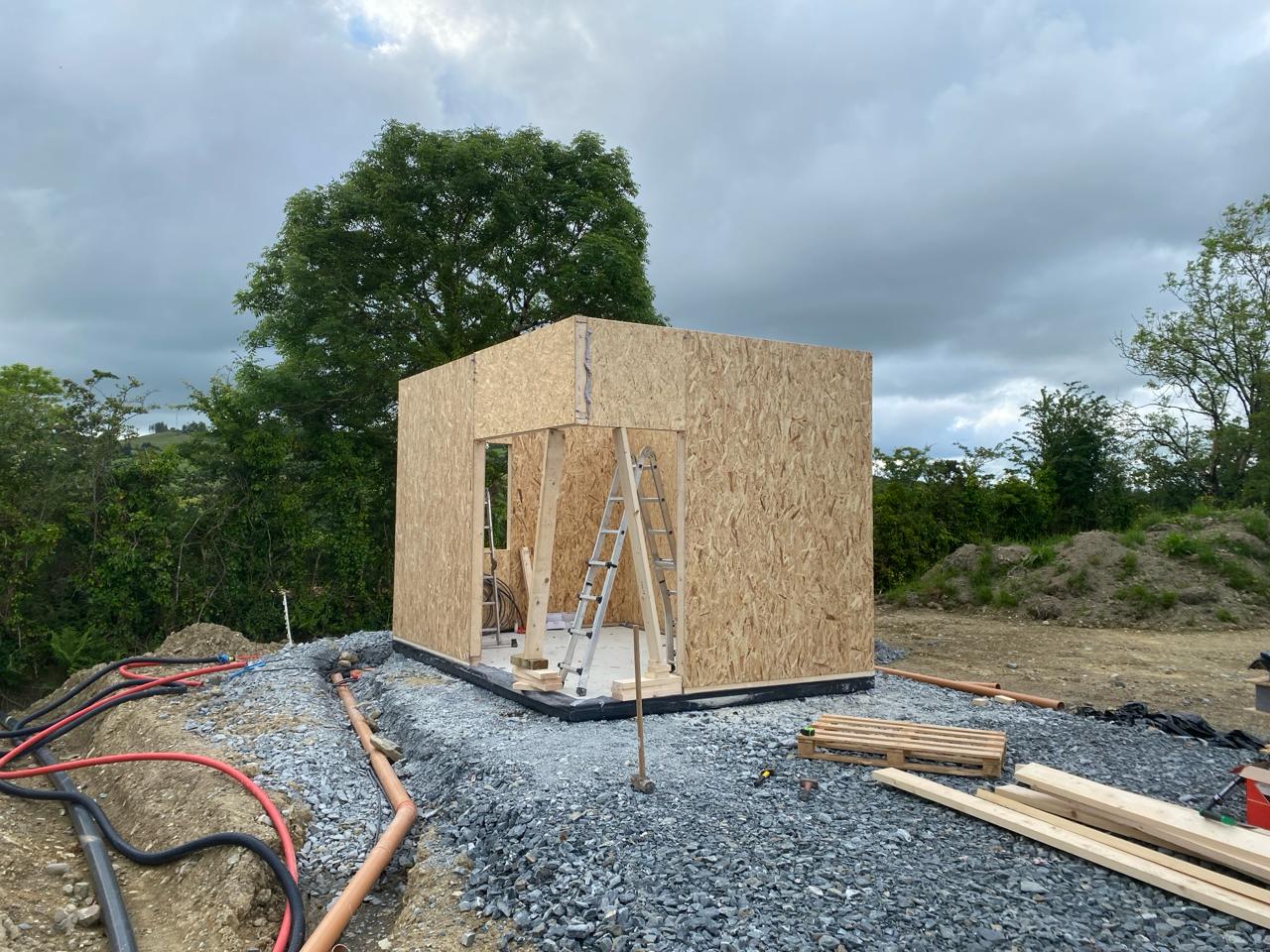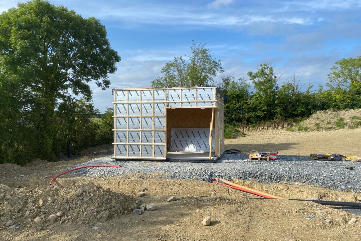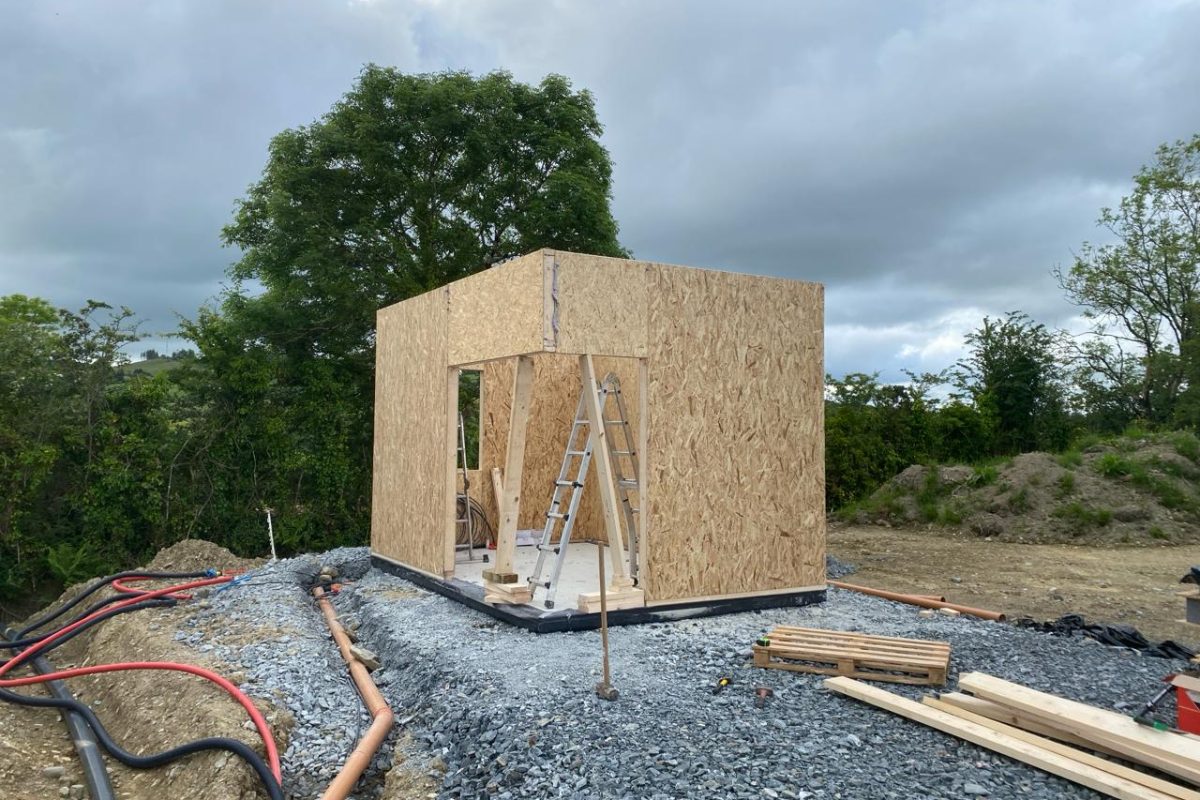 - Walls: 124mm OSB3 SIP panels with an additional 50mm PIR insulation layer