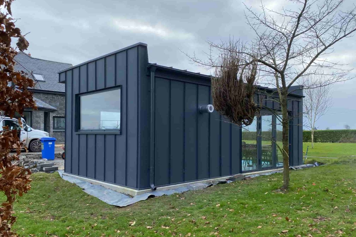 n Mullingar, we designed and built a 32m² garden room that combines modern style with high performance. Featuring full-height aluminium glazing, sliding windows to both the front and rear, and a sleek ventilated façade, the room offers a bright and versatile living space that blends seamlessly into the garden.