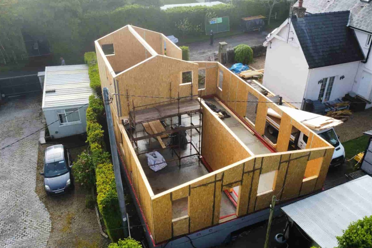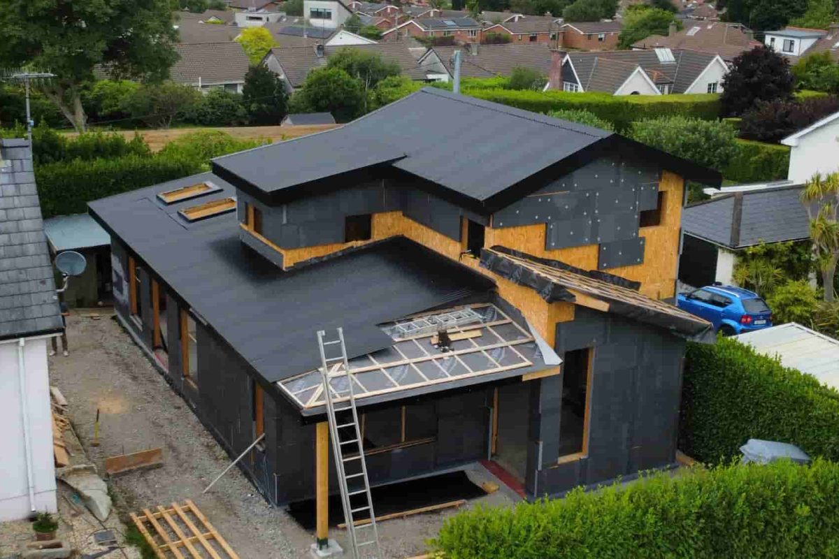 Our team designed and assembled the SIP structure with precision, integrating airtightness measures from the start. The use of ICF blocks for the foundation ring combined with SIP panels created a high-performance envelope. The 70mm EPS insulation and Caparol render provided both thermal improvement and a sleek, modern façade. The corrugated metal roof covering was chosen for durability and long-term weather protection.