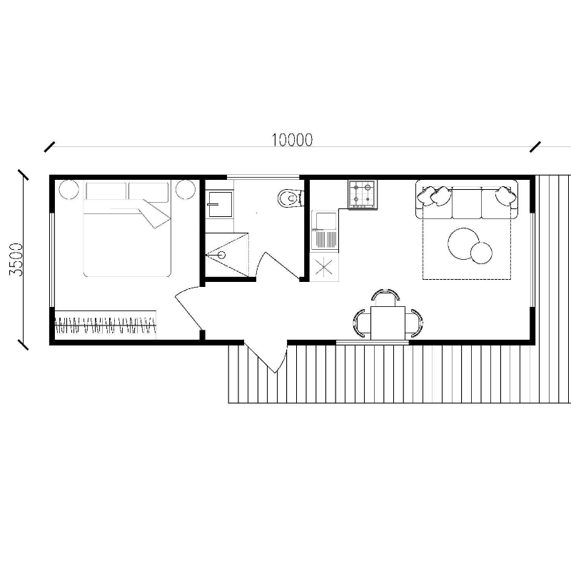 Introducing Madrid Tiny Home, the epitome of classic style and intelligent design in the world of tiny homes. With its spacious 34m2 layout, this tiny home is incredibly well-planned and perfect for those seeking a cozy yet roomy living space. As you step through the front patio door, you are greeted by the inviting 14.85m2 living room and kitchen area. Bathed in natural light, this space features a large 2m height window, providing a sense of openness and connection to the outdoors.