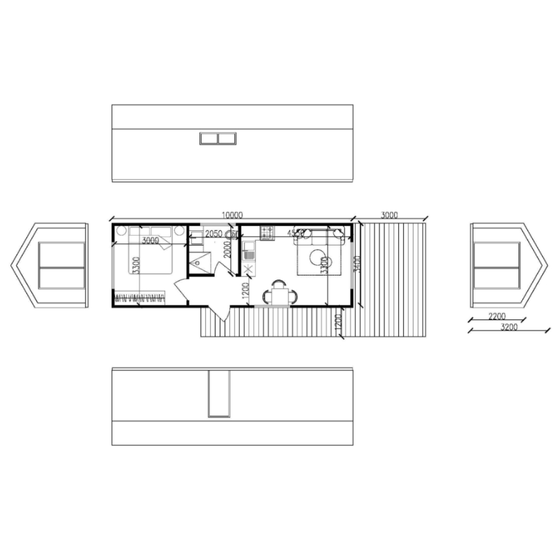 The clever design of Madrid Tiny Home ensures a clear separation between the living area and the bedroom, enhancing privacy and functionality. A well-designed corridor leads you to the 2.46m2 bathroom, equipped with modern amenities and stylish finishes. The 9.9m2 bedroom offers ample space for a king-size bed, large wardrobe, and two lockers for all your storage needs. The bedroom is further complemented by a double floor-to-ceiling window, adding a touch of elegance and capturing picturesque views.